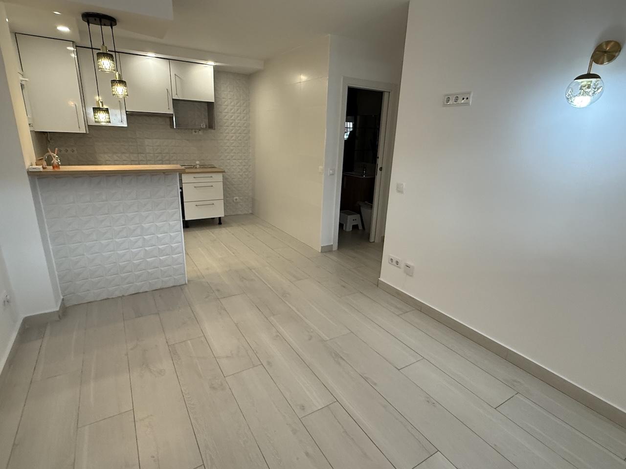 Vivienda de 42 m2 construidos, salón con cocina americana amueblada.
